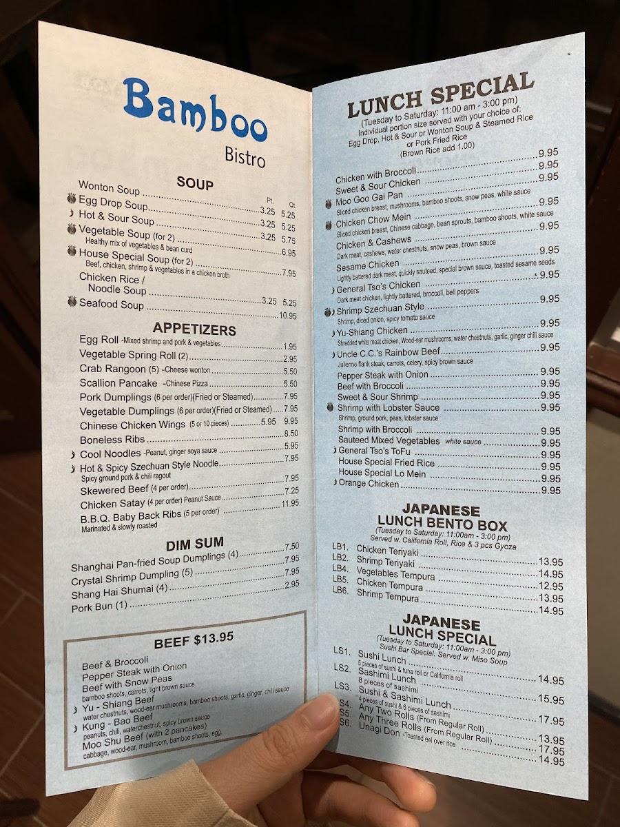 Bamboo Bistro specializes in a diverse range of Asian cuisine, from mouthwatering sushi to comforting Chinese favorites. As you step inside, you’ll be greeted by a warm and friendly atmosphere, highlighted by a clean and modern decor that makes it perfect for both casual dinners and special gatherings.